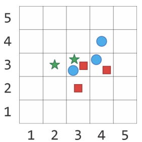 The picture below explains the first sample (only a relevant part of the grid is shown). To get exactly $K = 6$ combinations of toppings, Flora has to use the machine a minimum of $T = 3$ times. In the picture, the first topping applied by the machine is represented as a pineapple (★), the second as a cherry (■), and the third as a blueberry (●). The lists of pieces having each combination of toppings are as follows: