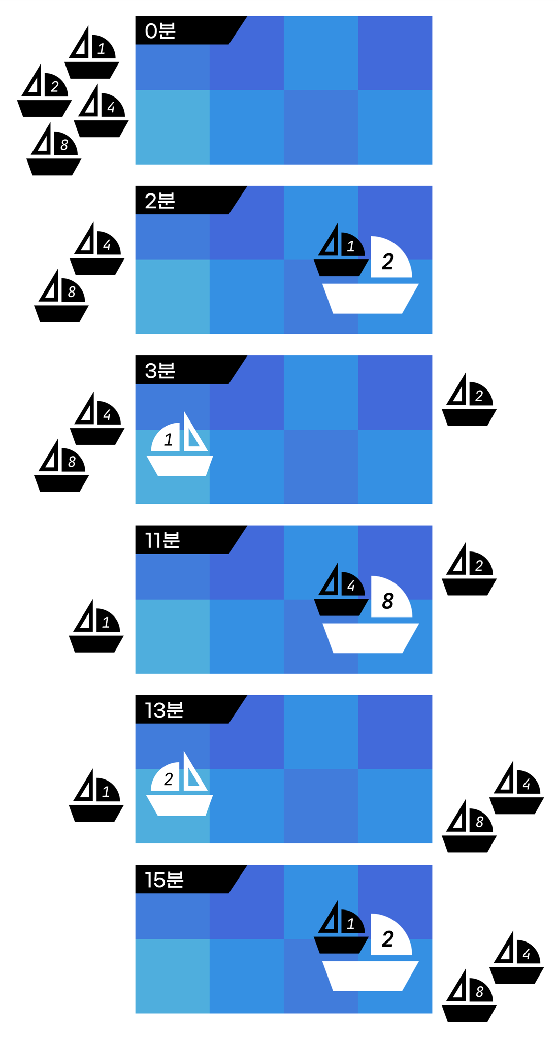 1번 예제에서 배를 옮기는 방법은 다음과 같다. 치훈이가 운전하고 있는 배는 흰색으로 표시하였다.