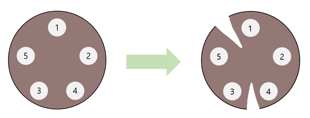 위의 그림에서 $1$이 적혀있는 접시를 $1$번 접시라고 한다면, $3$번과 $4$번 접시의 연결을 끊고, $5$번과 $1$번 접시의 연결을 끊어 $[1, 2, 4],\ [3, 5]$의 정렬된 $2$개의 수열을 얻을 수 있다.