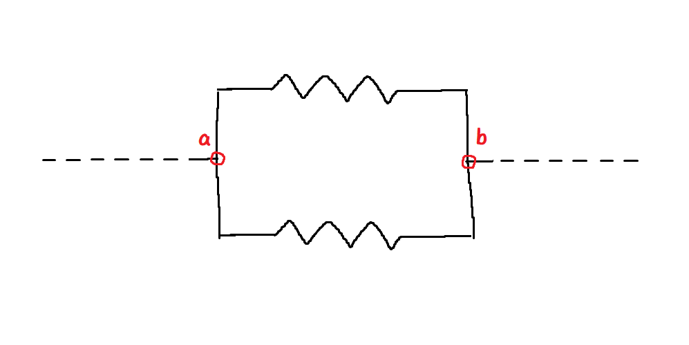그림 4. 병렬 연결의 예시입니다. 그림에서 $a$와 $b$ 사이 저항의 연결 형태를 두고 병렬 연결이라고 부릅니다.
