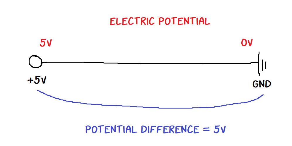 그림 1. 전압 공급원과 접지 간의 전위차가 $5 \, \text{V}$인 경우의 회로도입니다.