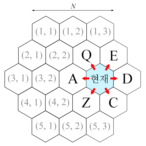 정후는 펜타곤에서 영감을 얻어 지었다는 유명 건축가의 육각형 형태의 건축물에 방문한 뒤 이색적인 아름다움에 매료되었다. 건축물은 $3N^2-3N+1$ 개의 정육각형 방으로 이루어져 있고, 이 방들은 다시 한 변이 $N$ 개의 방으로 이루어져 있는 정육각형 형태로 배치되어 있다. 다시 말해, 방들이 $2N-1$ 행으로 이루어져 있으며, $i$ 번째 행에는 $2N-1-|i-N|$ 개의 방이 배치되어 있다. 맞닿은 두 방 사이에는 문이 있어 서로 오갈 수 있다. 즉, 하나의 방에서 맞닿은 최대 여섯 개의 방으로 이동할 수 있으며, 각각의 이동은 아래 그림과 같이 Q, E, D, C, Z, A의 로마자 대문자로 나타낼 수 있다. 아래 그림에서 $(i, j)$는 $i$ 번째 행의 $j$ 번째 방을 의미하며, 현재 세 번째 행의 네 번째 방에 위치해 있는 상황이다.