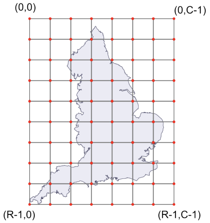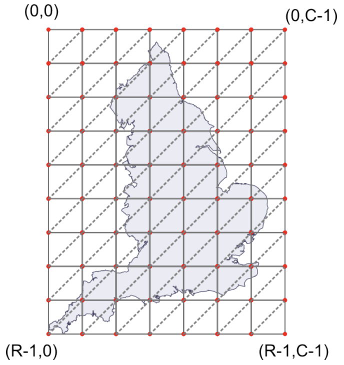 To measure the terrain landscape, a commercial satellite will scan a rectangular area of $R - $1 meters by $C - 1$ meters. (You can be sure that this area will completely enclose the island.) The area is then divided into an uniform grid with $R \times C$ grid points, and the satellite will measure the elevation above sea level (in centimeters) at every grid point. The above figure gives such an example; the elevation will be measured for every red point in the grid. The resulting 2D array is called a heightmap, and this will be given as your input.