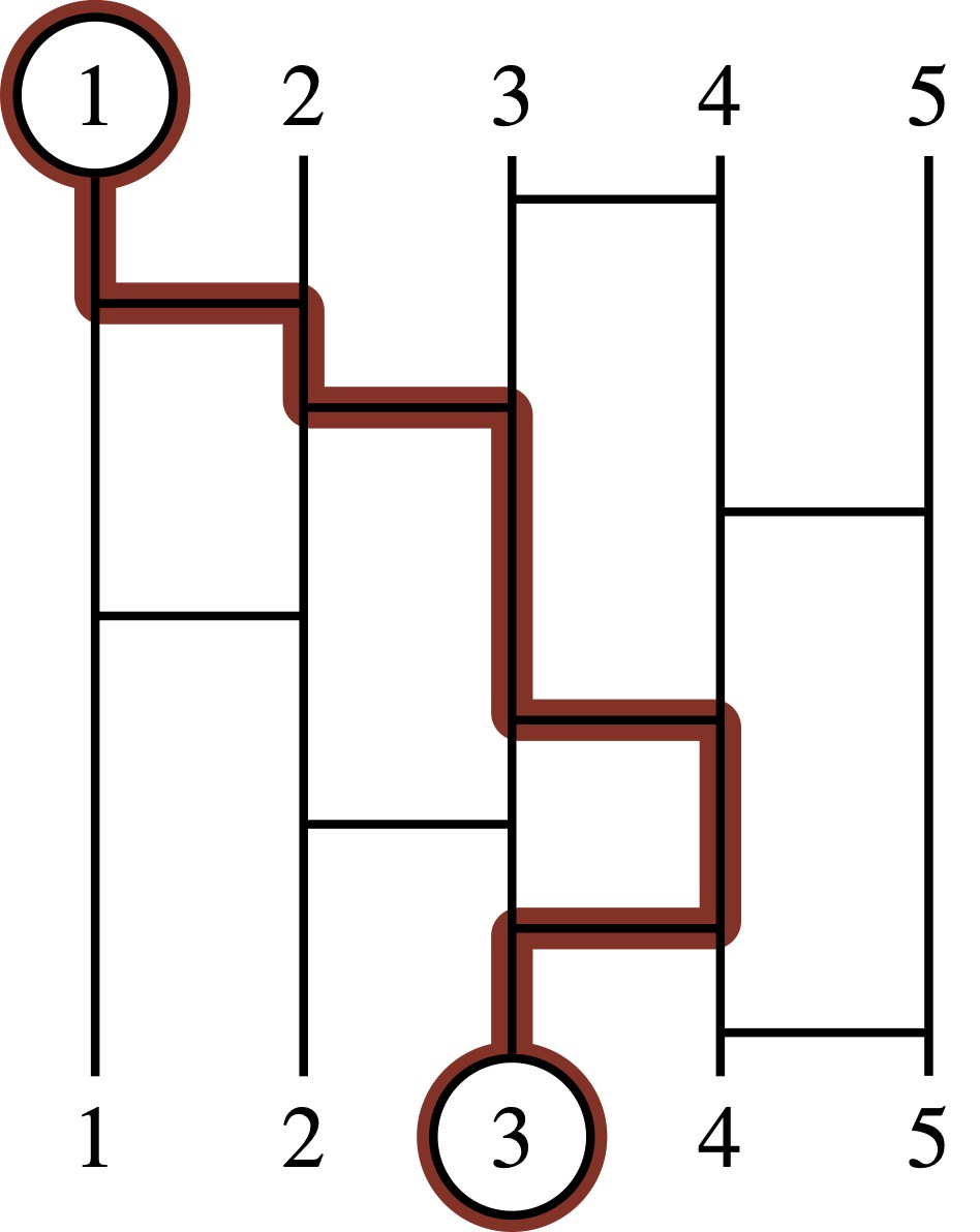 Figure J.1: Visualization of an Amida-kuji game. The first person is connected to the third prize. This is also Sample Input 2 after all connections are added and before any connection is removed. To connect the $i$th person to the $i$th prize, it suffices to remove both horizontal bars between legs $2$ and $3$ and the topmost horizontal bar between legs $3$ and $4$. This is the only minimal solution.