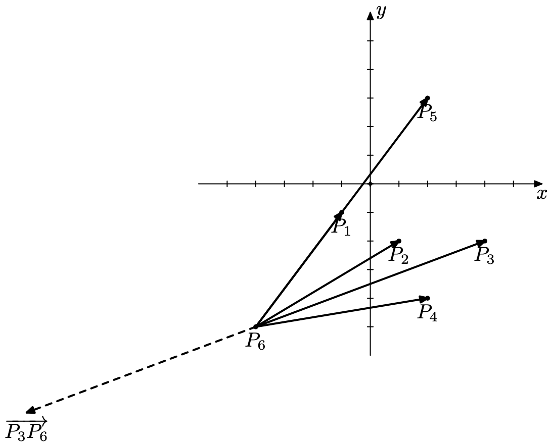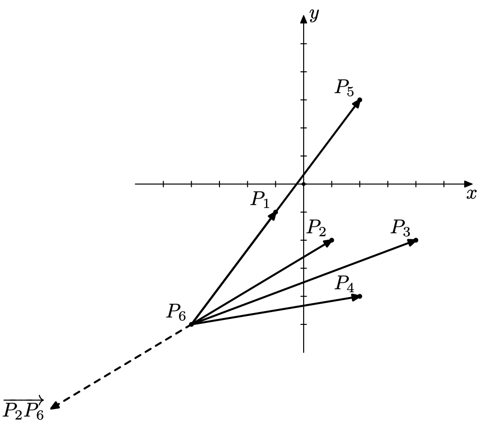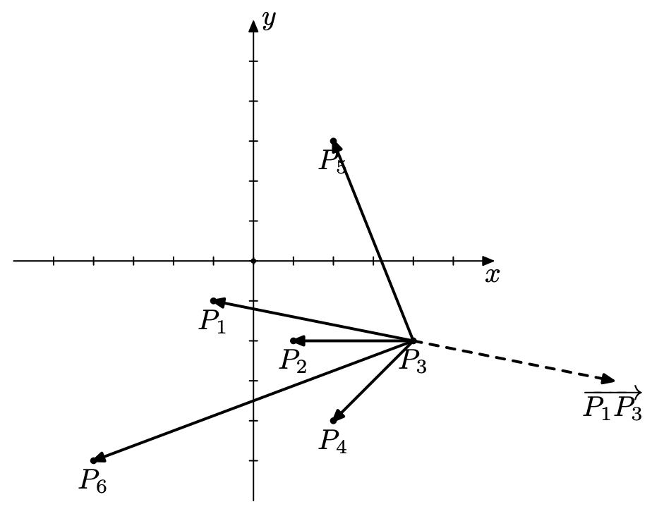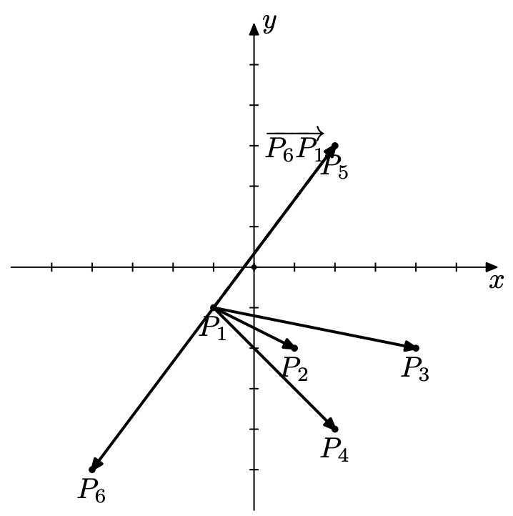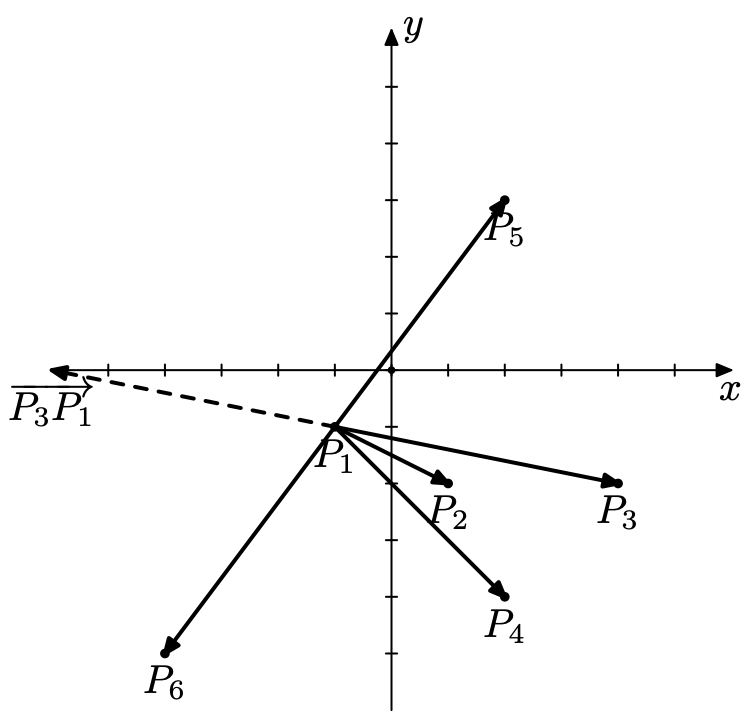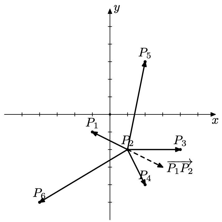 | Рисунок 1: Пример множества из $6$ точек | Рисунок 2: Вектор $\overrightarrow{P_1P_2}$, а также векторы из точки $P_2$ во все остальные точки |