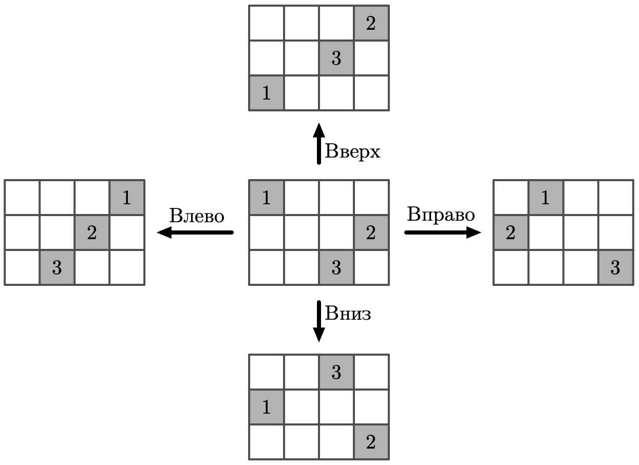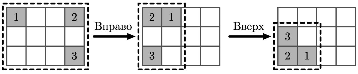Ниже изображена сетка с $3$ строками, $4$ столбцами и тремя ячейками, содержащими изображения, с координатами $(1, 1)$, $(2, 4)$ и $(3, 3)$. А также изображено, куда перейдут эти изображения при нажатии на каждую из четырёх кнопок.
