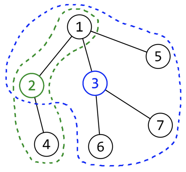 Sashka is responsible for the maintenance of the flowers in the city garden. The garden consists of $N$ flower beds, numbered with the integers from $1$ to $N$, where some of the flower beds are connected by pipes. The beds and the pipes form a connected, acyclic, undirected graph, in which the flower beds are the nodes and the pipes – the edges. In each bed there is an installed pump which can pump water from the underground. This water irrigates the bed in which the pump is located and sends water through the pipes to some of the beds that have a path of pipes to them. The pumps are numbered from $1$ to $N$, with one pump’s number being equal to the number of the bed it is located in. If the pump located in a bed with number $x$ ($1 ≤ x ≤ N$) works for $p$ minutes, the water will reach all beds that have distance within $p - 1$ edges from $x$ in the acyclic graph. The system of pumps is such that one pump runs first, then another one and so on. Two pumps never work simultaneously. A pump can run only once. A flower bed is considered irrigated if water has reached it, regardless of which pump. The pumps are designed in such a way, that if a pump with number $m$ runs, it should run at most $t_m$ minutes, otherwise it can malfunction. A run of a pump must continue an integer number of minutes. The pumps are identical and consume electricity as follows: $1$ minute run costs $c_1$ euro, $2$ minute run costs $c_2$ euro and so on. If a pump doesn’t run, it won’t consume electricity. Sashka is given the task of determining the minimum amount of money for electricity, when an appropriate set of pumps runs, so all the flower beds can be irrigated.