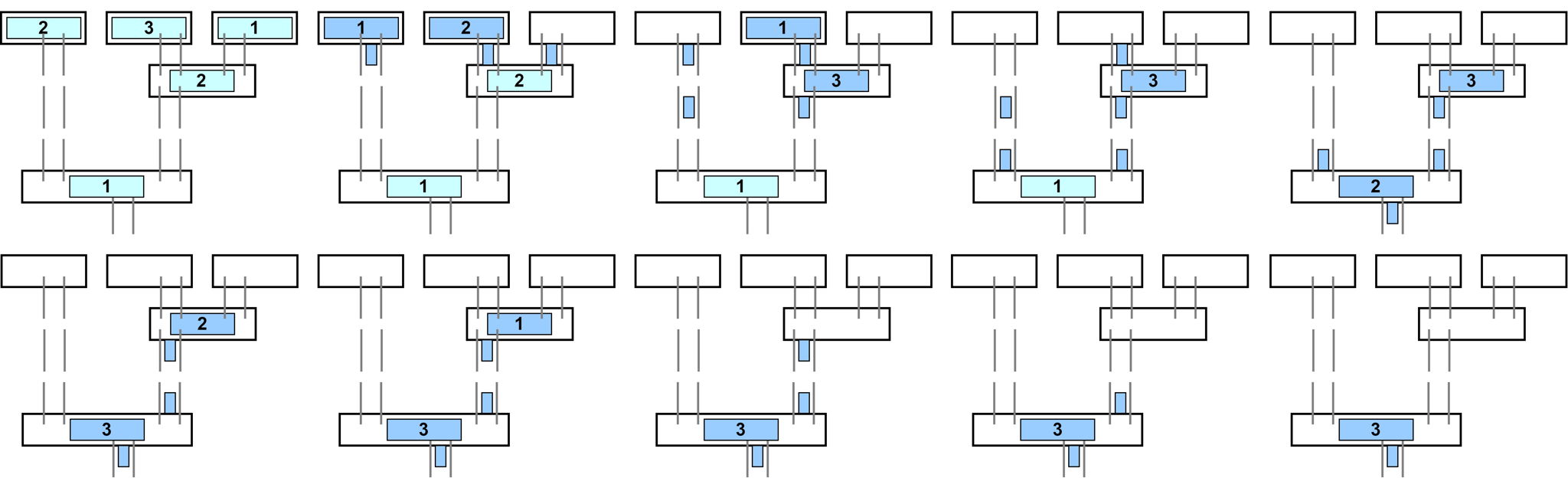 Ниже приведено изменение заполненности комнат для второго примера в первые 10 минут, начиная с 0.
