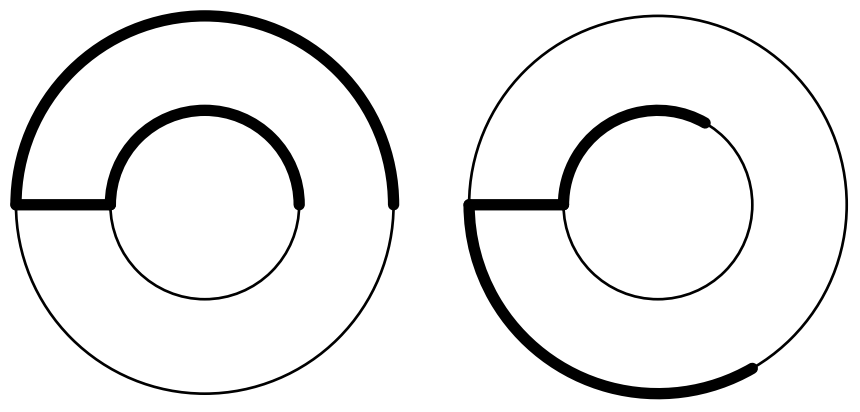 Сейчас Ньют продумывает план поимки Нюхля. Помогите ему, ответьте на $q$ его вопросов. Вопрос номер $j$ задается двумя числами: $a_j$ и $b_j$, он значит, что Ньют хочет узнать кратчайшее расстояние от точки на первом кольце, такой, что угол наклона отрезка, проведенного в нее из начала координат, равен $a_j$, до точки на втором кольце, имеющей аналогичный угол наклона равный $b_j$.