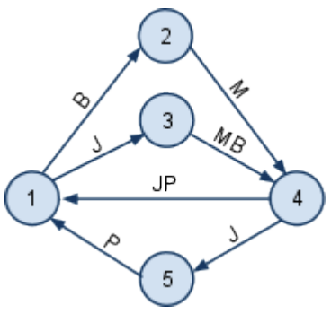 아래와 같이 교차로 5개, 도로 7개인 경우를 살펴보자. (밀가루: B, 계란: J, 우유: M, 잼: P)