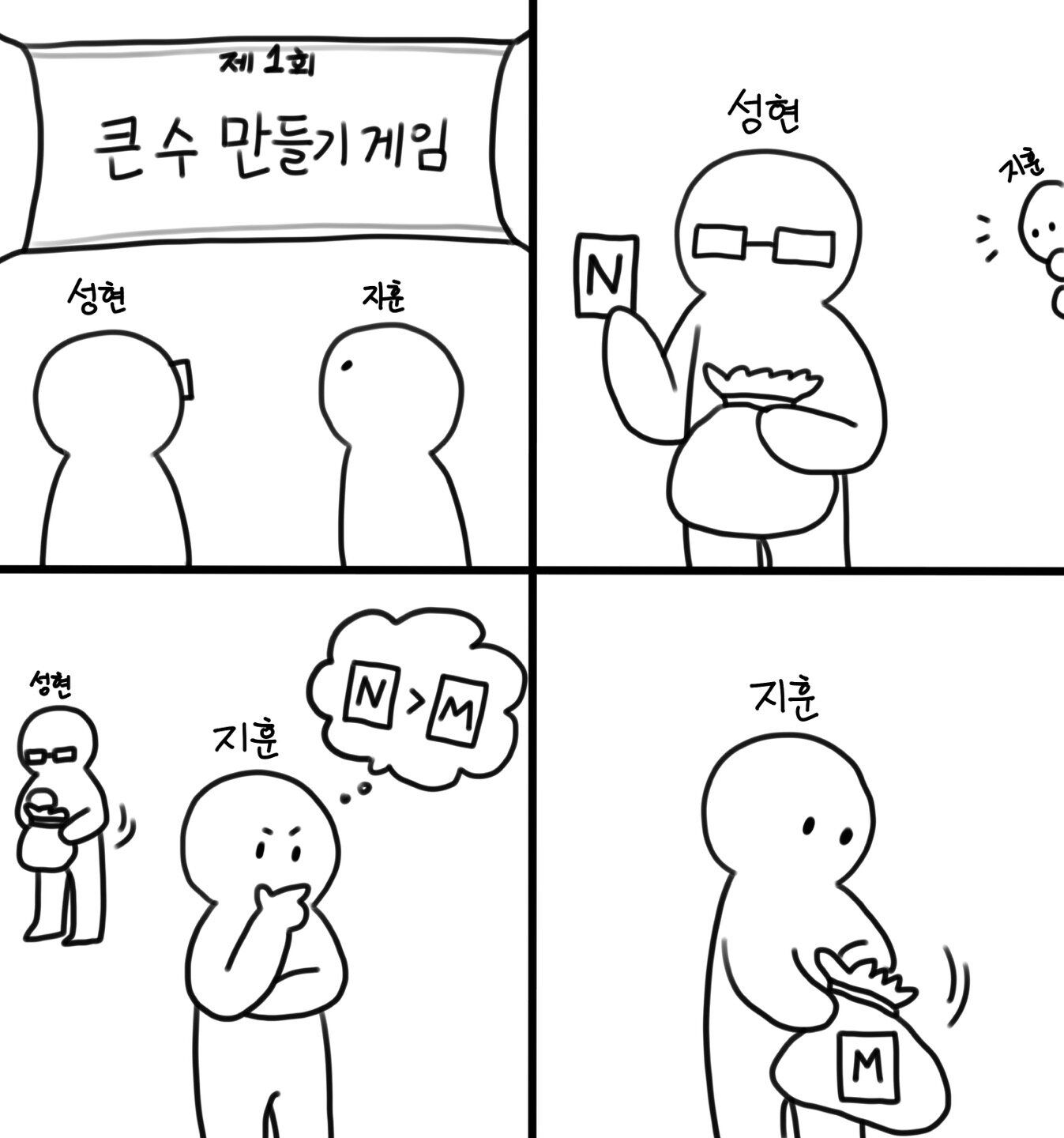성현이와 지훈이는 큰 수 만들기 게임을 하고 있다. 성현이는 양의 정수 $N$이 적힌 카드 $1$장이 들어 있는 주머니를 들고 있다. 지훈이는 성현이의 카드를 몰래 본 다음 성현이의 카드에 적힌 $N$보다 작은 양의 정수 $M$을 선택하여 카드에 적은 후 자신의 주머니에 넣었다. 이 둘은 각자 $1$장의 카드가 들어 있는 주머니를 가지고, 다음 두 동작 중 원하는 동작을 원하는 만큼 수행할 수 있다.