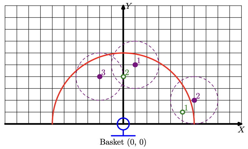 Поле представляет из себя полуплоскость, каждая точка которой задается целыми координатами $x$ и $y$ такими, что координата $y$ неотрицательна. Кольцо находится в точке $(0, 0)$. Также есть трехочковая дуга, представляющая полуокружность с радиусом $r$ и центром в точке, в которой находится кольцо. Если расстояние игрока до кольца строго больше, чем $r$, то его забитый бросок считается за три очка, иначе за два. Эдвард знает, что все игроки его комады бросают одинаково. Каждый игрок команды противника обладает защитными навыками, измеряемыми натуральными числами.