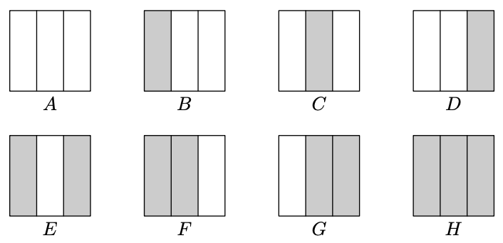 После того как Александру и Игорю на работе не повысили зарплату, они уволились и увлеклись дженгой. В игре дженга есть башенка состоящая из нескольких слоев. Каждый слой состоит из не более чем трех расположенных параллельно блоков. Блоки из соседних слоев лежат перпендикулярно друг другу. Ниже нарисованы все возможные слои, где серый цвет соответсвует наличию блока, а белый --- его отсутсвию.