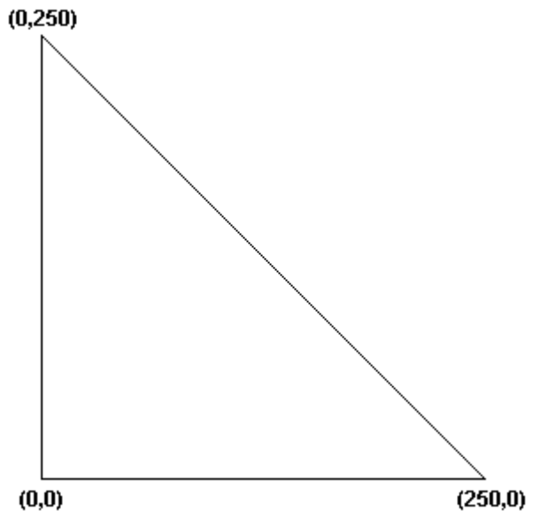 수영장은 위에 그림에서 보이듯이 좌표 평면 위에 있다. 그리고, 두 끝점이 삼각형의 변 위에 있는 선분을 이용해서 두 구역으로 나눌 것이다. 두 구역은 넓이가 같아야 한다.