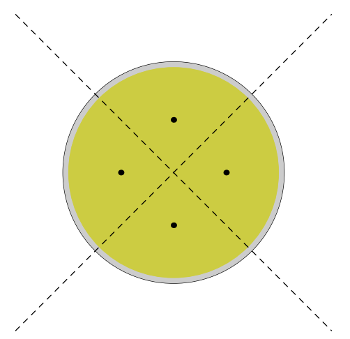 Чтобы избежать этого Кристофер Робин решил разрезать торт на четыре одинаковые части, а чтобы подчеркнуть торжественность, ведь это не обычный торт, а праздничный, и не усложнять разрезание, торт нужно разрезать двумя перпендикуряными разрезами, проходящими через его центр, причем на каждом из получившихся кусков должно быть ровно по одной свечке. При этом, чтобы никто не получил нецелую свечку и не обиделся, Кристофер Робин хочет, чтобы разрезы не проходили ни через одну свечку.