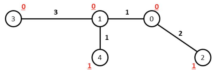 init(5, [0, 0, 1, 1], [1, 2, 3, 4], [1, 2, 3, 1], [0, 0, 1, 0, 1])