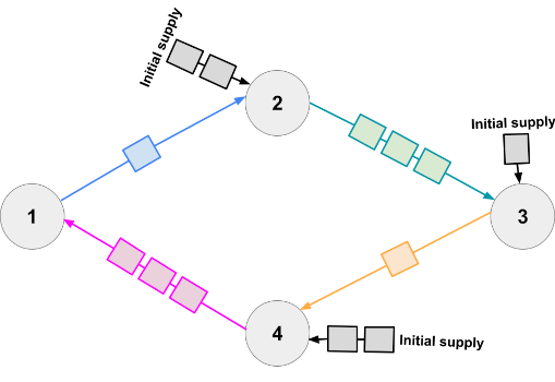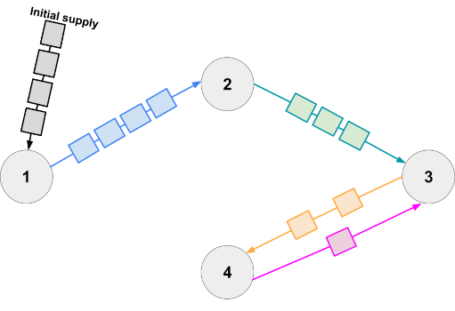 For example, suppose that station $1$ sends a train carrying exactly $3$ railroad cars to station $4$. Now, if station $4$ needs $2$ cars, it could reuse $2$ of the cars it received from station $1$. And if station $4$ needs to send $5$ cars, it can reuse all $3$ cars received from station $1$ and add $2$ of its own supply. Note that when station $4$ needs to send $2$ cars, it cannot send all $3$ it received from station $1$.