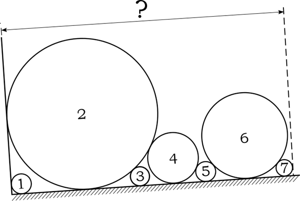 Valter is a fan of experiments. His latest experiment is depicted in the figure: he rolls several pipes down an inclined floor until they are stopped either by the wall perpendicular to the floor or by another pipe rolled earlier; after all the pipes have stopped, Valter measures the distance from the wall to the farthest point of the farthest pipe.