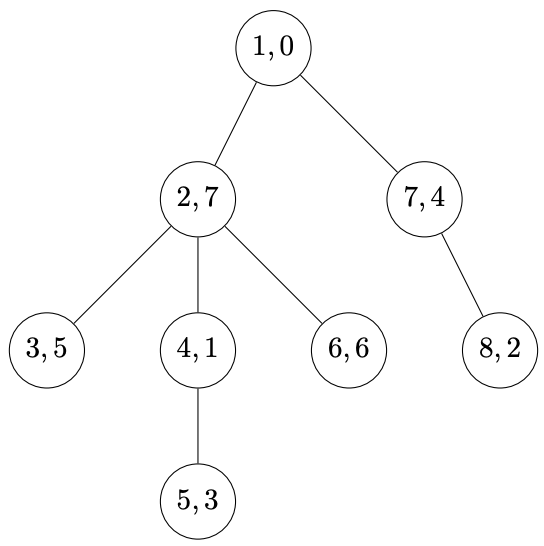 Standardsisendi esimesel real on tehaste arv $N$ ($1 \le N \le 10^5$). Teisel real on $N$ täisarvu $P_1 \ldots P_N$ ($1 \le P_i < i$), kus $P_i$ tähendab, et tehaste $i$ ja $P_i$ vahel on tee (erandina $P_1 = 0$ ja ei esita teed). Kolmandal real on $N$ täisarvu $T_1 \ldots T_N$ ($0 \le T_i < N$), mis näitavad tehaste tasemeid. On teada, et $T_1 = 0$ ja et kõik $T_i$ väärtused on erinevad. Neljandal real on poodide arv $M$ ($1 \le M \le 10^5$). Viimasel $M$ real on igaühel kolm täisarvu $C_i$, $L_i$ ja $R_i$ ($1 \le C_i \le N$ ja $0 \le L_i \le R_i < N$), mis tähistavad et pood $i$ asub tehase $C_i$ juures ja võib müüa tooteid tasemetega $L_i \ldots R_i$.