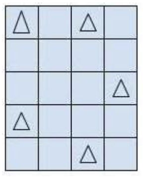 In the example above, there are 5 rows and 4 columns. The owners of the condos, denoted by triangles, do NOT want other condos in ANY of the potentially 8 adjacent (up, down, left, right, diagonal) grid squares. For example, the above layout is a valid arrangement of five condos.