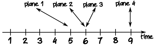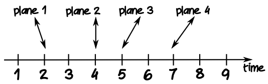 According to the regular flight schedule, plane 4 has to land at the time moment 7:
