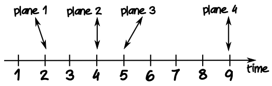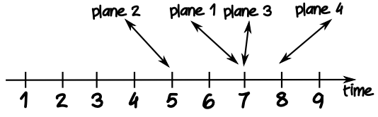 According to the primary flight schedule, the plane 2 has to land at the 2’nd moment of time and the plane 3 – at the 4’th moment of time.