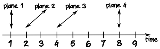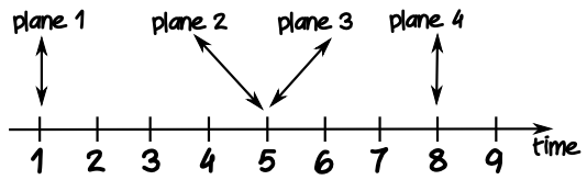 Then a notification is received about the delay of plane 1 – now it is expected to land at the 5’th moment of time. Because of the delay of this plane, the plane 2 will also have to be kept on air: