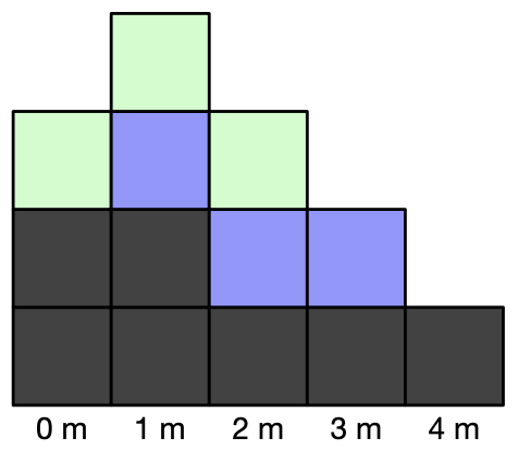 Automatinė kasimo sistema dirba vykdydama kasimo komandas. Kiekviena komanda sumažins karjero aukštį Hi metrų nurodytame intervale. 1 pav. parodyta, kaip keičiasi karjero aukštis įvykdžius dvi komandas, kurių pirma kasa intervale [0; 2], antra – [1; 3], abi iškasa 1 metro gylio duobes. Komandų iškasami plotai atitinkamai pažymėti žaliai (atspausdintoje nespalvotoje sąlygoje – šviesiai pilkai) ir mėlynai (nespalvotoje sąlygoje – pilkai).