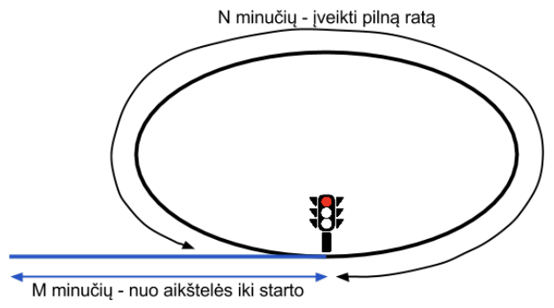 Žinodami, kad nuo stovėjimo aikštelės iki starto Mantas nuvažiuos per M minučių, o pilną ratą įveiks per N minučių (žr. iliustraciją), apskaičiuokite, kiek pilnų ratų Mantas apvažiuos iki pirmo sustojimo prie šviesoforo.