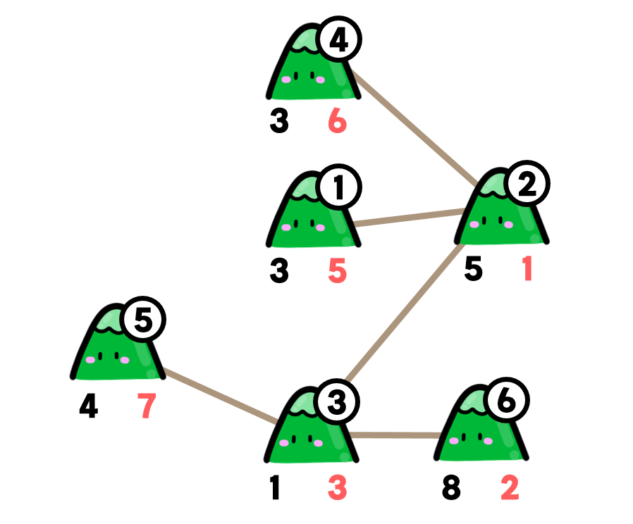 춘배 나라에는 $1$부터 $N$까지의 번호가 붙은 $N$개의 산, 그리고 두 산 사이를 이동할 수 있는 $N-1$개의 길이 있다. 게다가 임의의 두 산 사이를 항상 길을 통해 이동할 수 있다고 한다. 즉, 산을 정점, 길을 간선으로 생각하면 춘배 나라는 트리 형태이다.