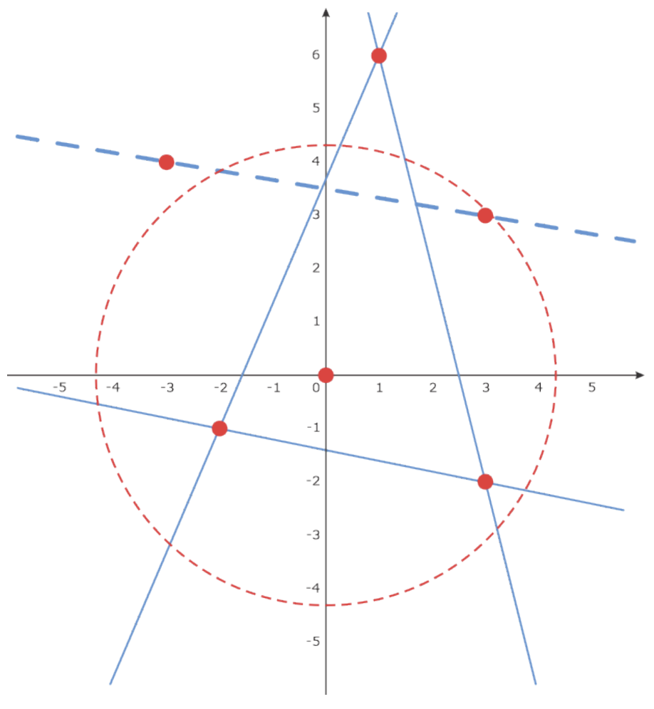 The figure below depicts the first sample. The circumference contains the points at distance exactly D from the den. When just the first three predictions are considered (solid lines), the bear can still reach points in the circumference. Once the fourth prediction (dashed line) is also considered, no point in the circumference can be reached from the den.