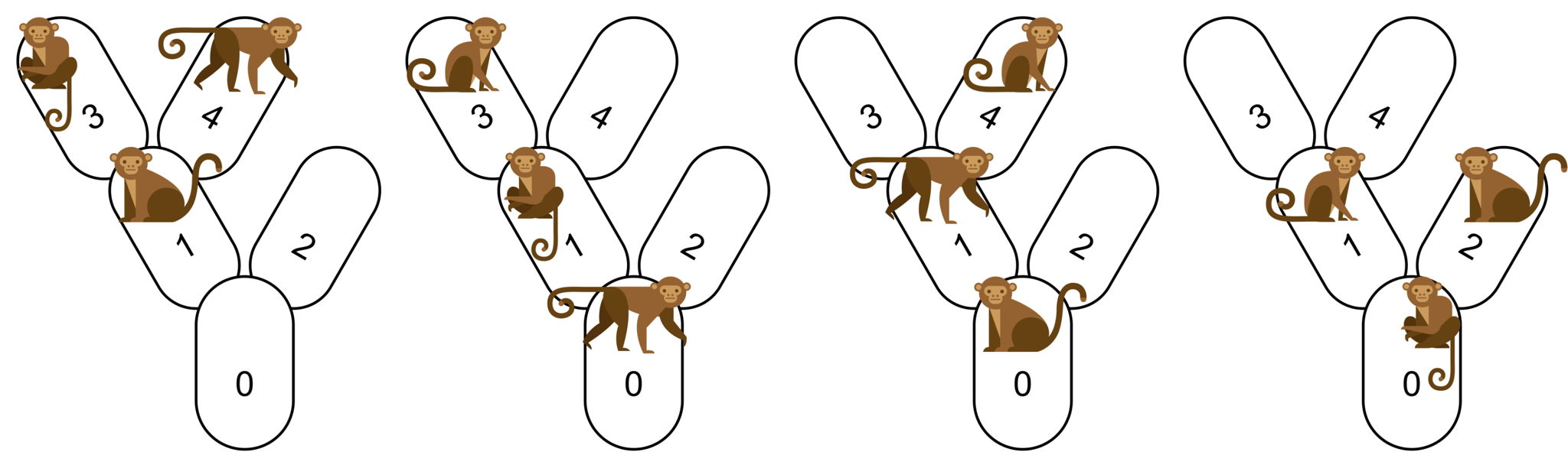 The branches are numbered from $0$ to $n-1$, inclusive. Branch $0$ is connected to the roots of the tree and can also host a single monkey.