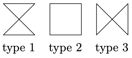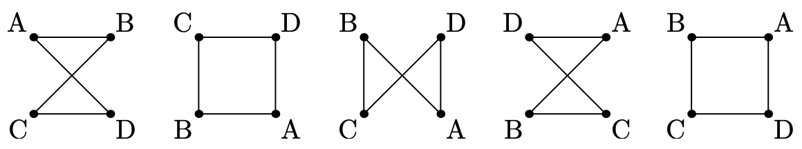 Consider four integers $A$, $B$, $C$, and $D$, such that $A < B < C < D$. Let's put them in the corners of a square in some order and draw a loop $A - B - C - D - A$. Depending on the arrangement of the integers, we can get different loop shapes, but some arrangements produce the same shape: