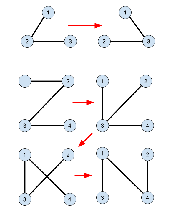 I see $n$ contacts connected by $n - 1$ wires. Contacts are numbered with integers from $1$ to $n$. Bomb has a security mechanism that ensures the following condition: if there exist $k \geq 2$ contacts $c_1, c_2, \ldots, c_k$ forming a circuit, i. e. there exist $k$ distinct wires between contacts $c_1$ and $c_2$, $c_2$ and $c_3$, $\ldots$, $c_k$ and $c_1$, then the bomb immediately explodes and my story ends here. In particular, if two contacts are connected by more than one wire they form a circuit of length $2$. It is also prohibited to connect a contact with itself.
