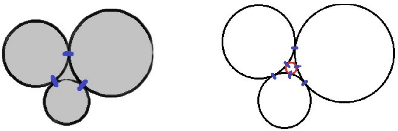 Это заселение продолжалось многие годы, и затем, как и на старой планете, на Луне стало слишком мало места, поэтому люди решили достраивать базы. Они придумали в базу из трёх модулей добавлять четвёртый, если он достаточно мал, чтобы уместиться между тремя другими куполами. И естественно им необходимо построить новые переходы, для этого новый модуль должен стоять вплотную к трём другим. Но нужно знать радиус этого четвертого купола, чтобы потом построить его на специальной М-фабрике.