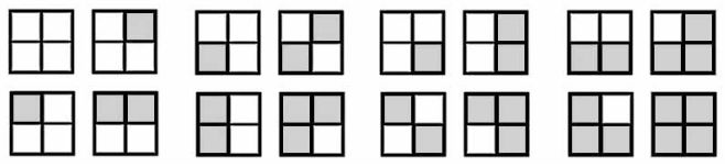 Каждый день летних каникул Миша рисовал в блокнотике аккуратное прямоугольное поле размером N × M клеточек и закрашивал на нём некоторые клеточки. Отметим, что каждый день у Миши получалась новая картинка, непохожая на другие, таким образом, всего у Миши получилось 2NM картинок (на рисунке ниже закрашенные клетки обозначены серым).