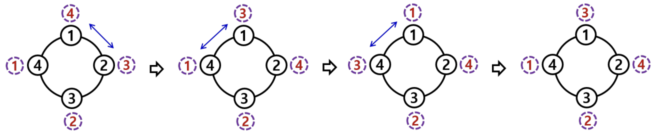 There are $n$ coins each of which is numbered as one of $\{1, 2, \dots , n\}$ and the numbers of two coins can be same. Initially, each vertex of $C$ has a coin among those coins. Then two vertices can swap their coins with each other. For a walk $w = (v_1, v_2, \dots , v_k)$ in $C$, a walk swapping is to swap two coins on $v_i$ and $v_{i+1}$ in the order of $i = 1, 2, \dots , k - 1$. Here, a walk $w$ is a sequence of $k$ ($≥ 1$) vertices whose consecutive two vertices are different and adjacent in $C$, and it can be considered as the vertices visited when you traverse $C$. Also, $k$ is called the length of $w$. For a walk of length $k ≥ 2$, $k - 1$ swaps in its walk swapping occur, and for a walk of length one, there is no swap. The figure below shows the progress of the walk swapping for the walk $(2, 1, 4, 1)$ in the cycle with $4$ vertices.