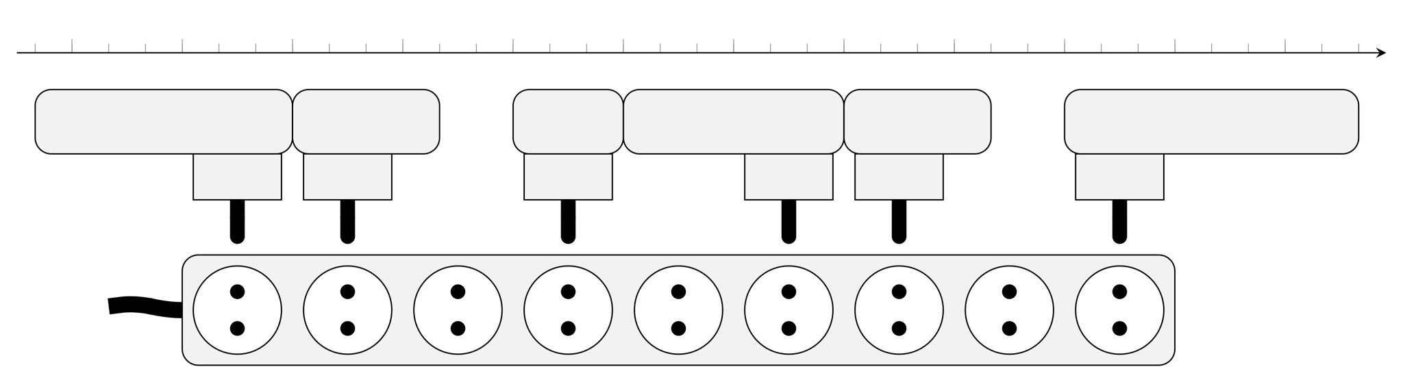 Your power strip comprises a row of $s$ sockets, and each socket is $3 \text{cm}$ in diameter. Furthermore, as you examine the chargers, you notice that they all have integer lengths. The plug of each charger is always on one of the two ends, and each charger can only be used in two orientations. Chargers cannot overlap, but can touch, and can extend beyond the end of the power strip as long as they are plugged in to a socket. Now you challenge them to charge as many devices as possible. This is visualized in Figure A.1. Hoping that this allows them to avoid the training, your friends agree to write a program to solve this.