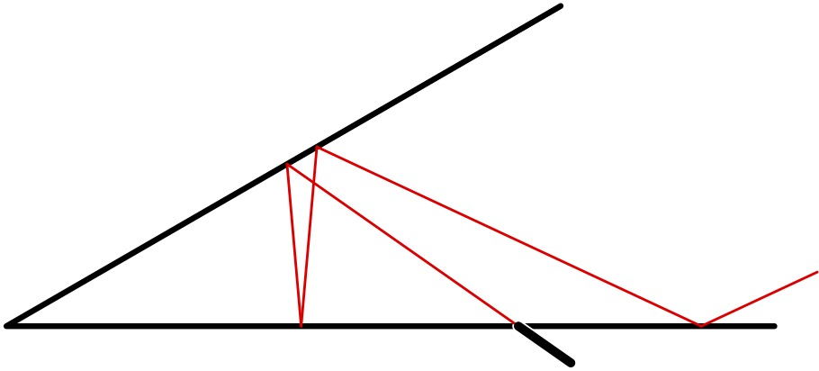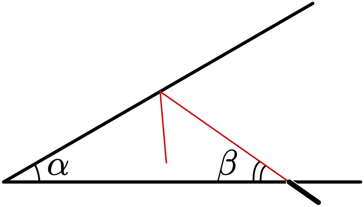There are two infinite flat mirrors located at an angle $\alpha$ relative to each other so that they can be considered as rays on the plane when viewed from the side. Through a tiny hole in one of the mirrors, a laser beam is launched at an angle $\beta$ as shown in the figure below: