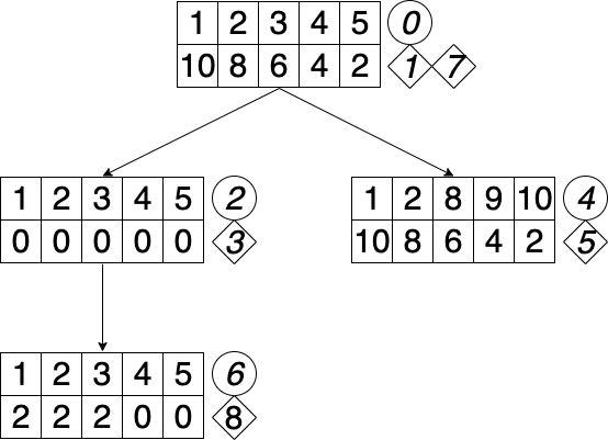 The number in a circle is the version, the numbers in rhombuses are queries of type $3$.