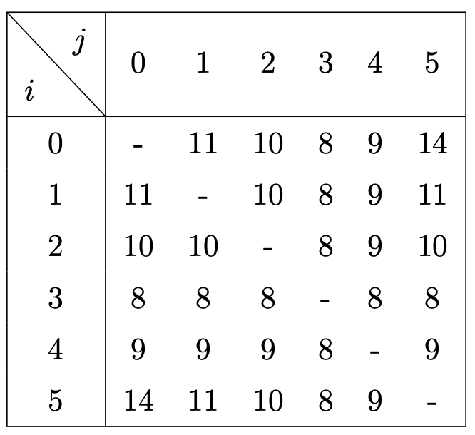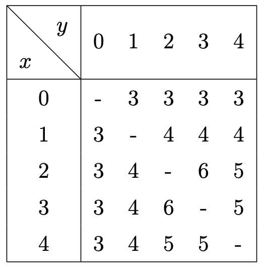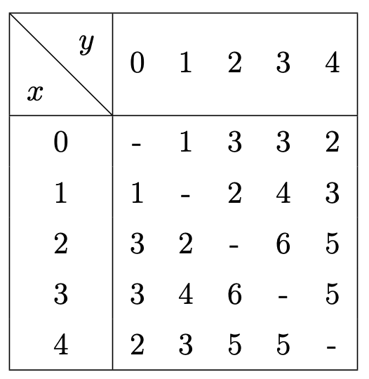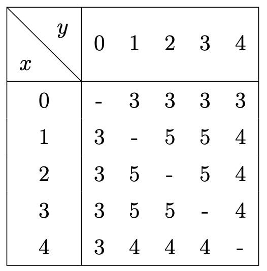 $x$번 도시와 $y$번 도시를 잇는 직통 열차의 소요 시간을 구해 보면 아래의 표와 같다.