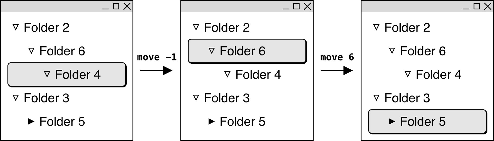 move $k$ : 커서를 $k$만큼 아래로 이동합니다. ($k$가 음수라면 $-k$만큼 위로 이동합니다.) 커서를 이동하다가 목록의 시작이나 끝에 도달하면 더이상 이동하지 않습니다. (그림 2)toggle : 커서가 가리키는 폴더를 접거나 펼칩니다. 폴더가 접혀 있었다면 펼치고, 펼쳐져 있었다면 접습니다.(그림 2) move 명령어를 사용하는 예제