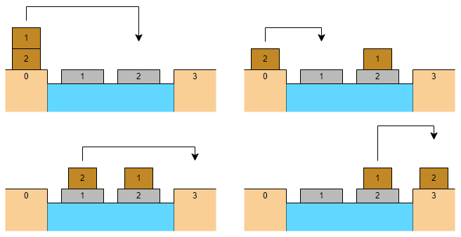 초콜릿 개구리들도 $1$부터 $N$까지 번호가 붙어 있으며, $0$번 지점에 아래에서 위로 $N$번부터 $1$번까지 순서대로 쌓여 있다. 개구리는 한 번에 한 마리만 이동할 수 있으며, 여러 마리의 개구리가 세로로 쌓여 있으면 그 중 맨 위의 개구리만 이동할 수 있다. 또한, $i$번 지점에 있던 개구리는 한 번의 이동으로 $i+1$번 또는 $i+2$번으로만 이동할 수 있으며, 뒤로 돌아갈 수는 없고, 번호가 작은 개구리 위에 번호가 큰 개구리가 올 수 없다.