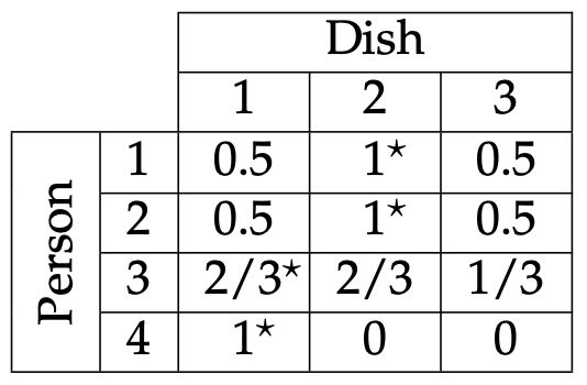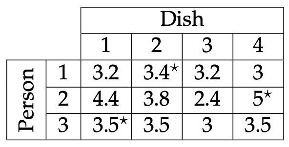 Here is the score table for each person on each dish. Each person’s favourite dish is indicated with a *; person 3 has three tied favourite dishes, so we chose the first one.