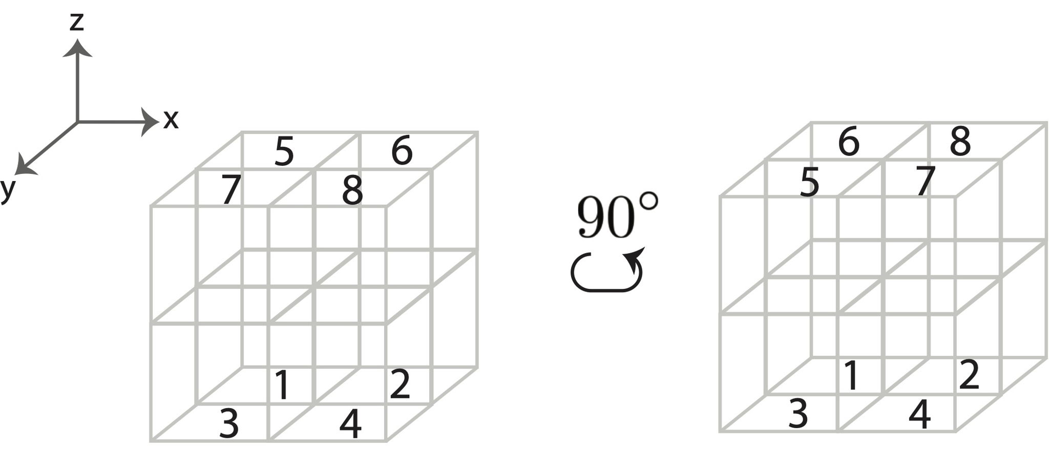 Imagine you are holding an $n \times n \times n$ cube, which is split up into $n^3$ smaller cubes labeled from 1 to $n^3$. The orientation of the axes is left-to-right for the $x$-axis, back-to-front for the $y$-axis, and bottom-to-top for the $z$-axis. For example, a $2 \times 2 \times 2$ cube is labeled as such: