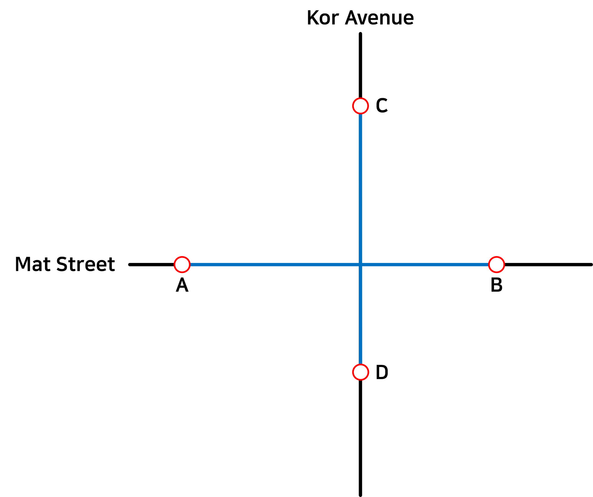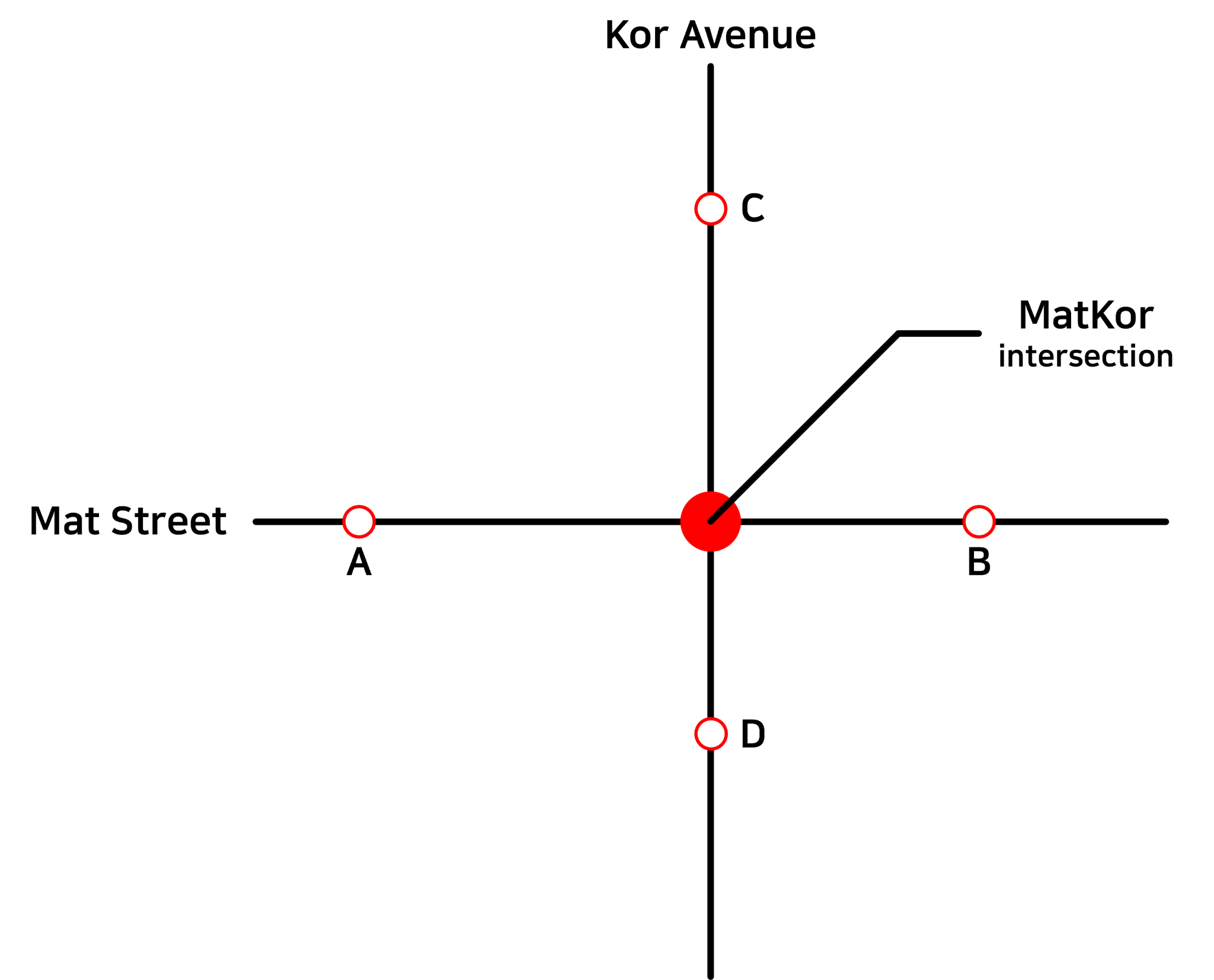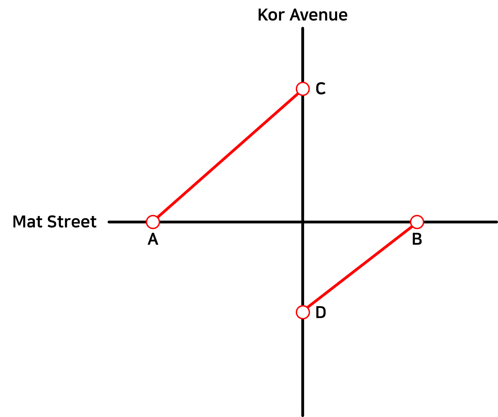 Mat Street에 사는 재우와 재현이는 2024년에도 외로운 하루를 보내고 있다. 동우는 이런 둘이 안쓰러워 마찬가지로 Kor Avenue에 사는 자신의 여사친 두 명과 2 대 2 미팅을 잡아주었다. Mat Street는 가로, Kor Avenue는 세로 방향의 도로이다. Mat Street와 Kor Avenue는 MatKor 사거리에서 수직으로 만나며, 각자 사는 집은 정확하게 Mat Street 혹은 Kor Avenue 위에 위치한다. 집이 정확히 사거리 위에 있을 수도 있다.
