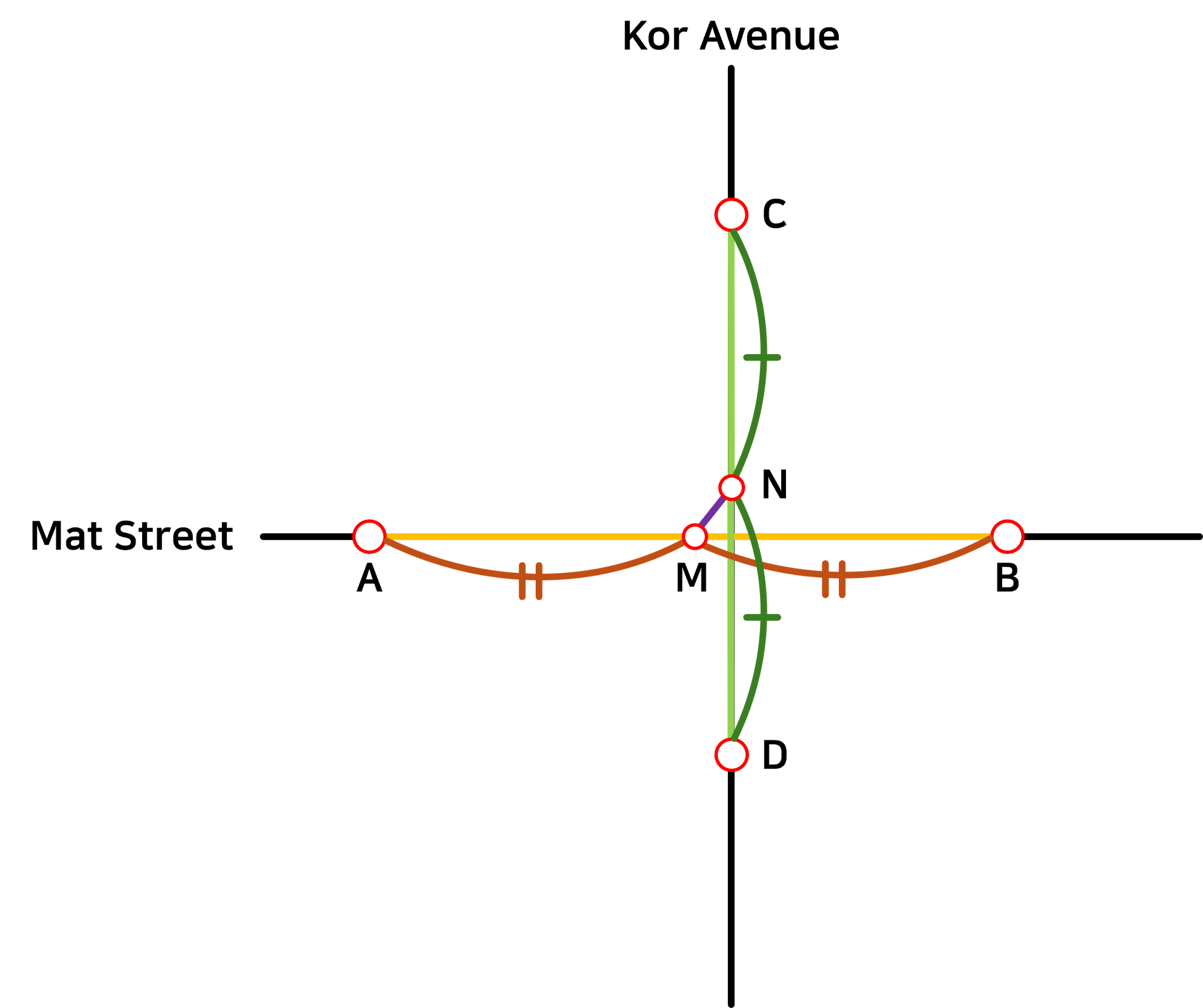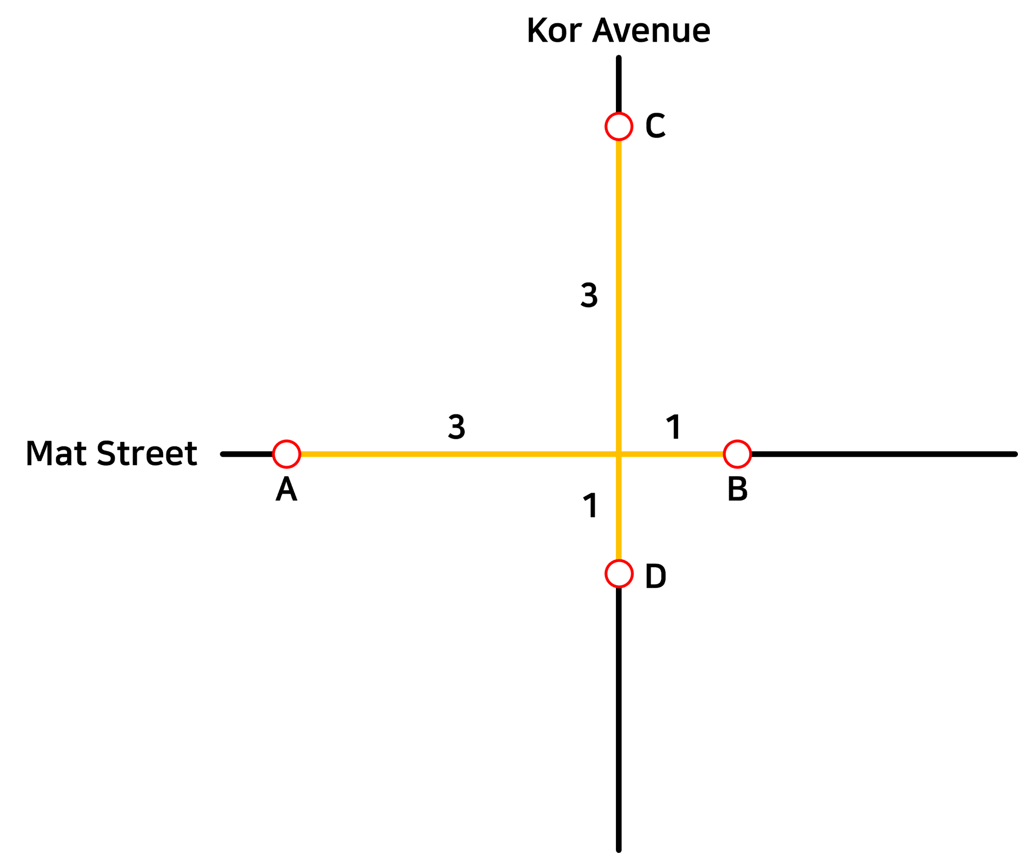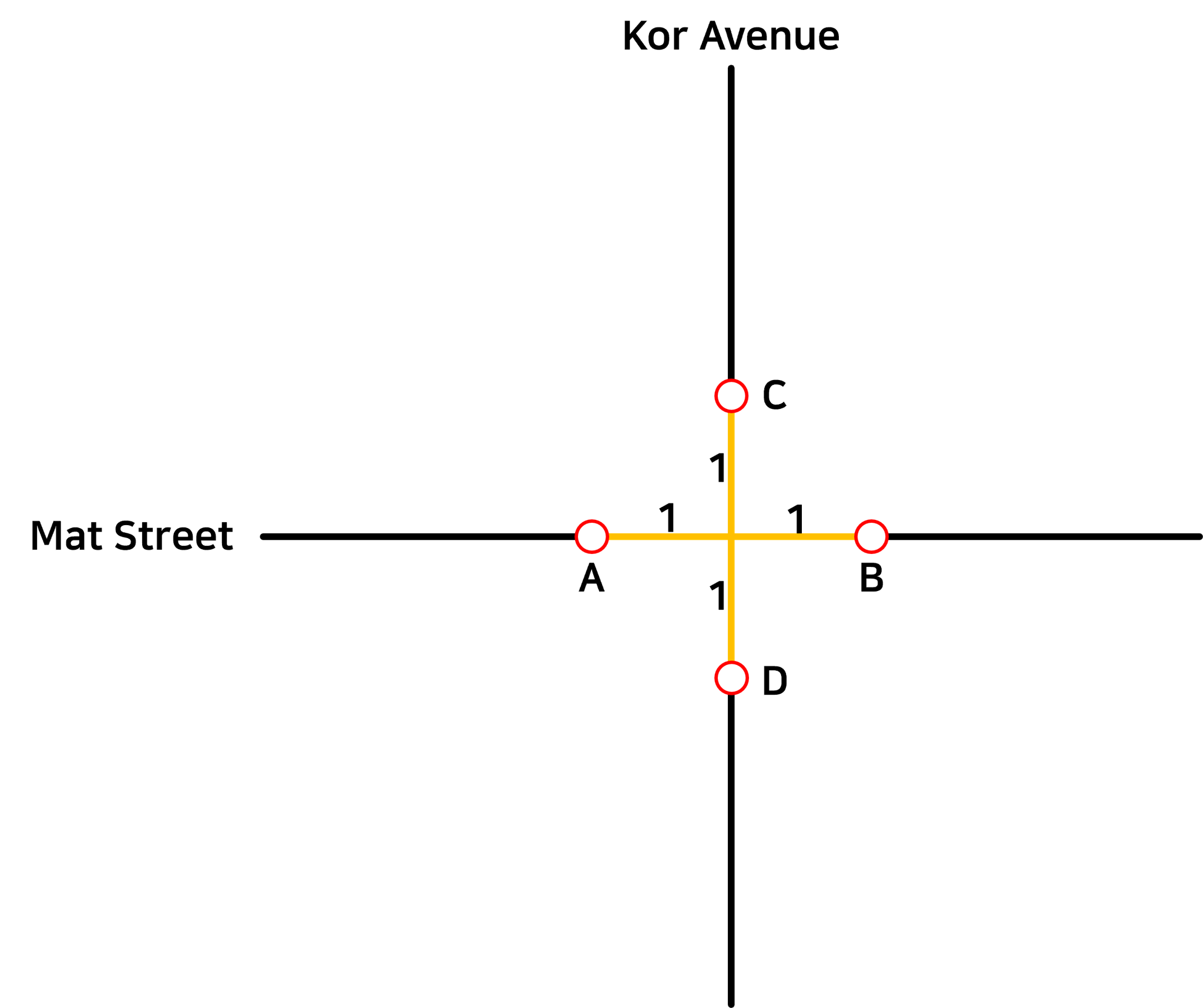 Mat Street에 사는 재우와 재현이는 2024년에도 외로운 하루를 보내고 있다. 동우는 이런 둘이 안쓰러워 마찬가지로 Kor Avenue에 사는 자신의 여사친 두 명과 2 대 2 미팅을 잡아주었다. Mat Street는 가로, Kor Avenue는 세로 방향의 도로이다. Mat Street와 Kor Avenue는 MatKor 사거리에서 수직으로 만나며, 각자 사는 집은 정확하게 Mat Street 혹은 Kor Avenue 위에 위치한다. 집이 정확히 사거리 위에 있을 수도 있다.