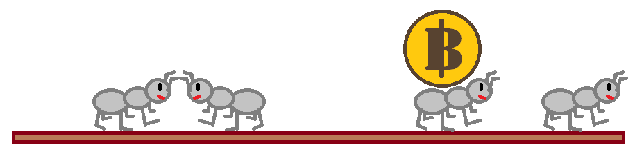 이 상황에서 약간의 시간이 지나면, 세 번째 개미와 네 번째 개미가 서로 만난다. 세 번째 개미가 비트코인을 가지고 있으므로, 세 번째 개미가 네 번째 개미에게 비트코인을 준 후 방향을 바꾼다.
