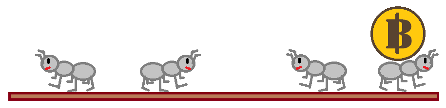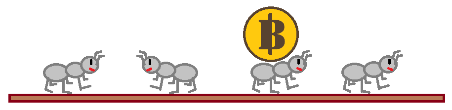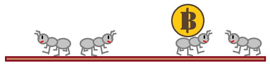 위 그림과 같이 네 마리의 개미가 비트코인을 가지고 있는 경우를 생각해보자. 잠깐의 시간이 지나면 아래 그림과 같은 상황이 벌어진다.