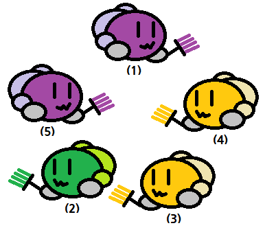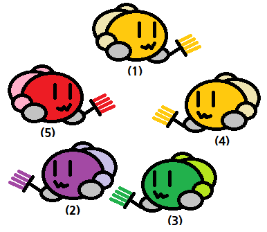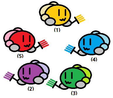 각 정령들은 시계방향을 기준으로 다음 위치에 있는 정령을 바라보고 있으며 항상 자신이 바라보는 정령을 색칠한다. $A$번 색을 가진 정령이 다른 정령을 색칠한다면, 그 정령의 색은 현재 $A$번 정령의 색과 똑같아진다. 위 그림에서 1번 정령이 4번 정령을 색칠하면 4번 정령의 색이 노란색(1번 색)이 된다.